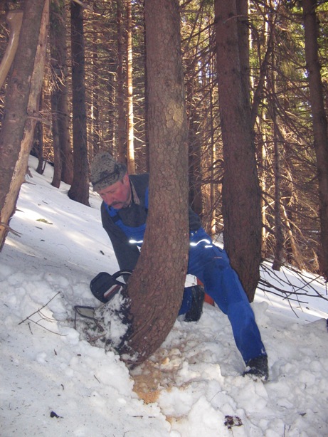 Alphorn aus einem krummen Fichtenstamm, der im Winter in 1100 m Meereshöhe geschlagen wurde.